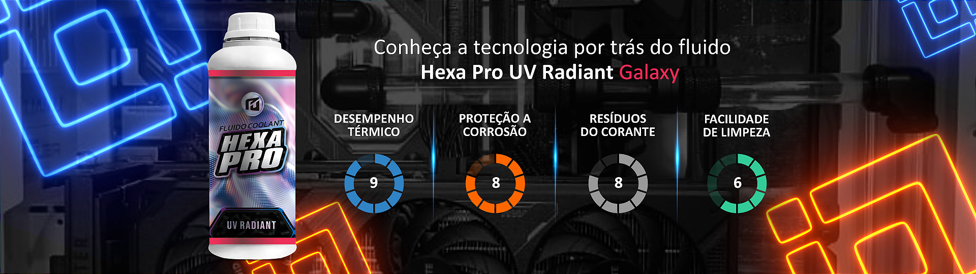 Assim como a linha tradicional HEXA PRO, os fluidos UV RADIANT foram desenvolvidos com água 99,9% pura, garantindo altíssima eficiência térmica, e com todos os inibidores e aditivos necessários para proteger o seu sistema de forma completa mesmo em setups com mistura de metais como cobre e alumínio.
