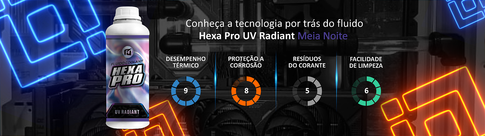 Assim como a linha tradicional HEXA PRO, os fluidos UV RADIANT foram desenvolvidos com água 99,9% pura, garantindo altíssima eficiência térmica, e com todos os inibidores e aditivos necessários para proteger o seu sistema de forma completa mesmo em setups com mistura de metais como cobre e alumínio.