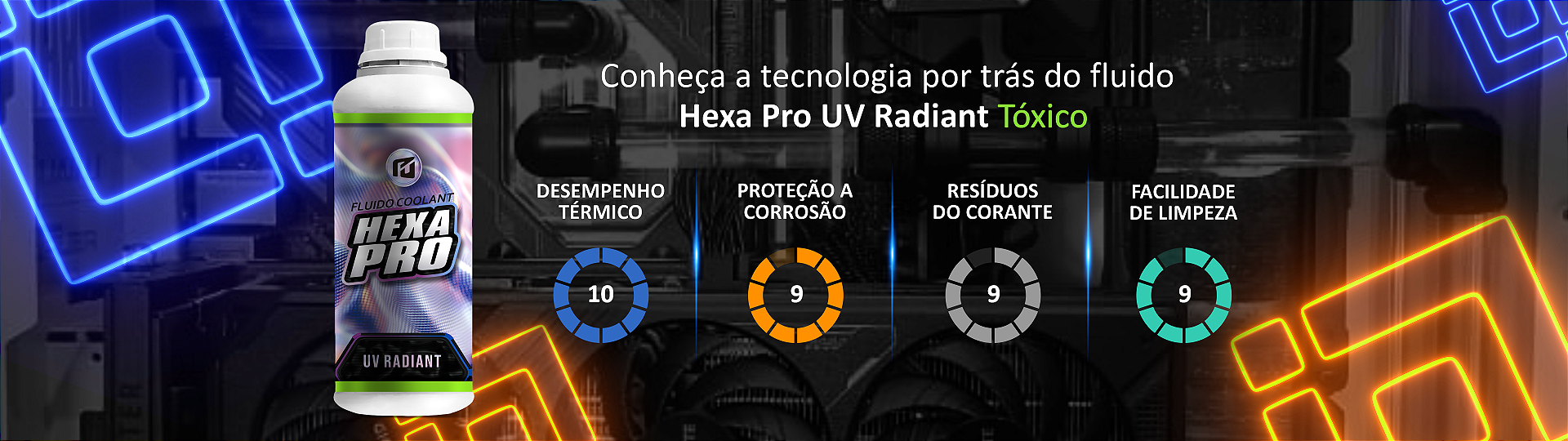 Assim como a linha tradicional HEXA PRO, os fluidos UV RADIANT foram desenvolvidos com água 99,9% pura, garantindo altíssima eficiência térmica, e com todos os inibidores e aditivos necessários para proteger o seu sistema de forma completa mesmo em setups com mistura de metais como cobre e alumínio.